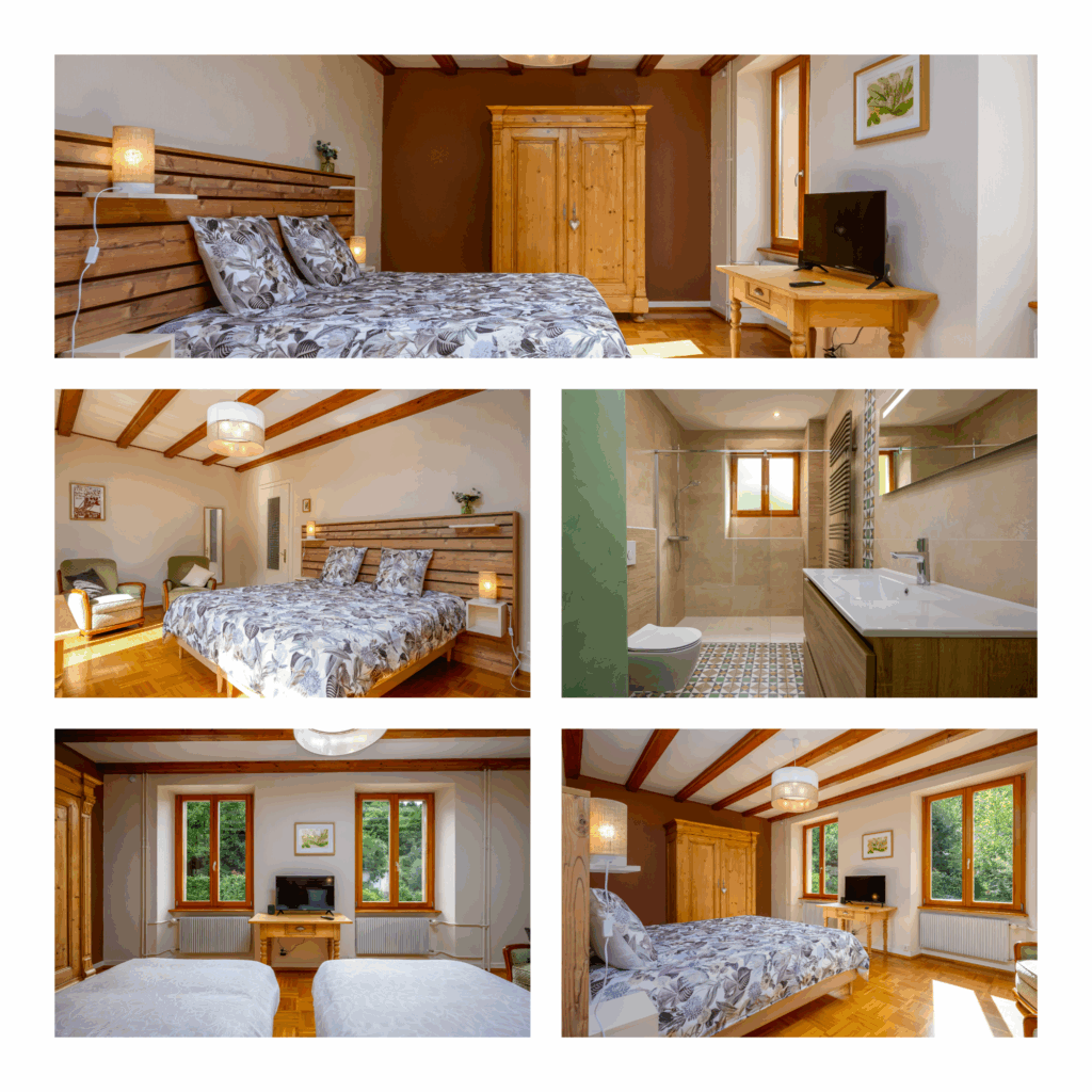 La Châtaigneraie vous offre un confort moderne et douillet sur 20 m2. La literie ainsi que le linge de lit et de toilette issu des meilleures usines textiles des Vosges sont de grande qualité. La spacieuse salle de douche privée et attenante a été entièrement rénovée pour vous recevoir. Le wifi et la télévision sont à disposition et deux fauteuils moelleux vous attendent pour un petit moment de détente.